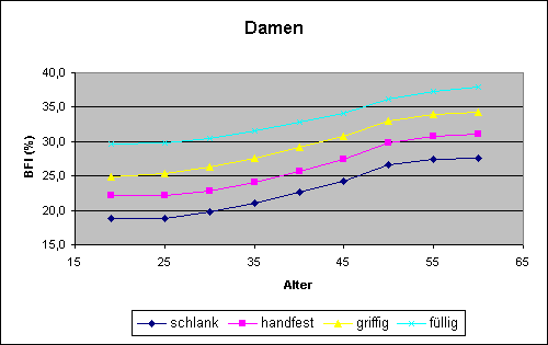 Eine 40-jährige gilt demnach als "handfest", solange ihr BFI über 22,5 % und unter 29,0 % liegt. Umgerechnet bedeutet das bei einer Größe von 170 cm ein Gewicht zwischen 62 kg und 78 kg. Hilft diese Erkenntnis weiter? Durchaus - nur wird es keine handfeste (im besten Sinne des Wortes) 40-jährige geben, die das nicht auch ohne eine Bio-Impedanz-Analyse wüsste.